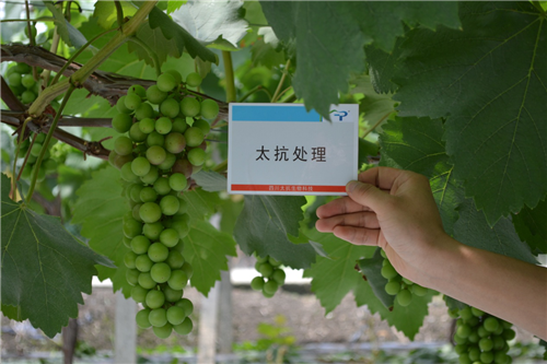 漫步在林蔭小道上,我們來(lái)到了使用太抗生物農(nóng)藥的葡萄種植區(qū),放眼望去,葡萄結(jié)果率高,果穗長(zhǎng),果粒大小均勻,葉片濃綠厚實(shí)。